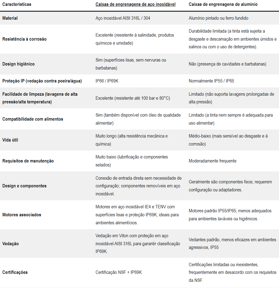 Em todas essas aplicações, os redutores de velocidade de aço inoxidável garantem higiene adequada e o mais alto nível de proteção contra contaminação bacteriana, em total conformidade com os mais rigorosos regulamentos de segurança alimentar.
